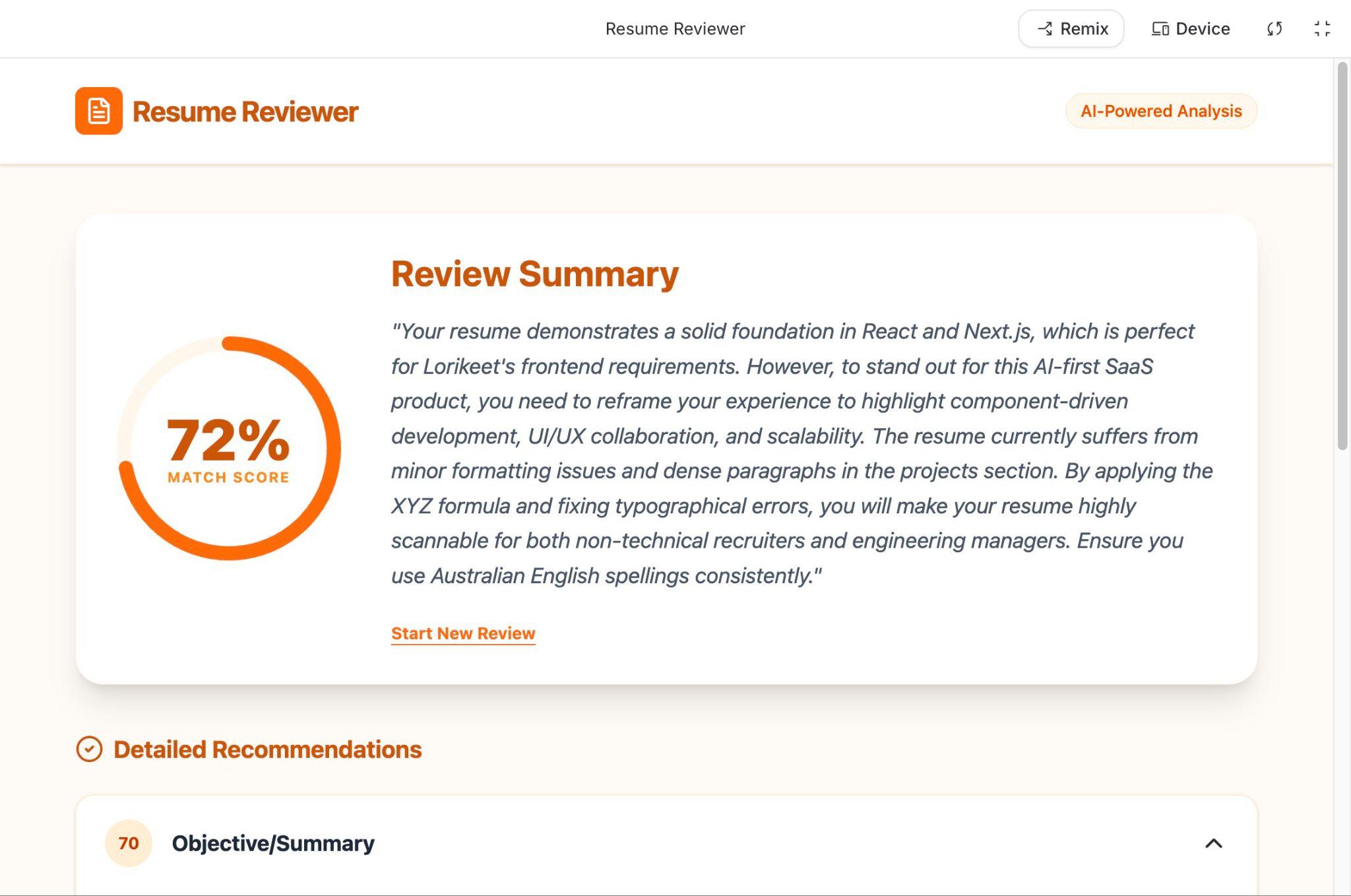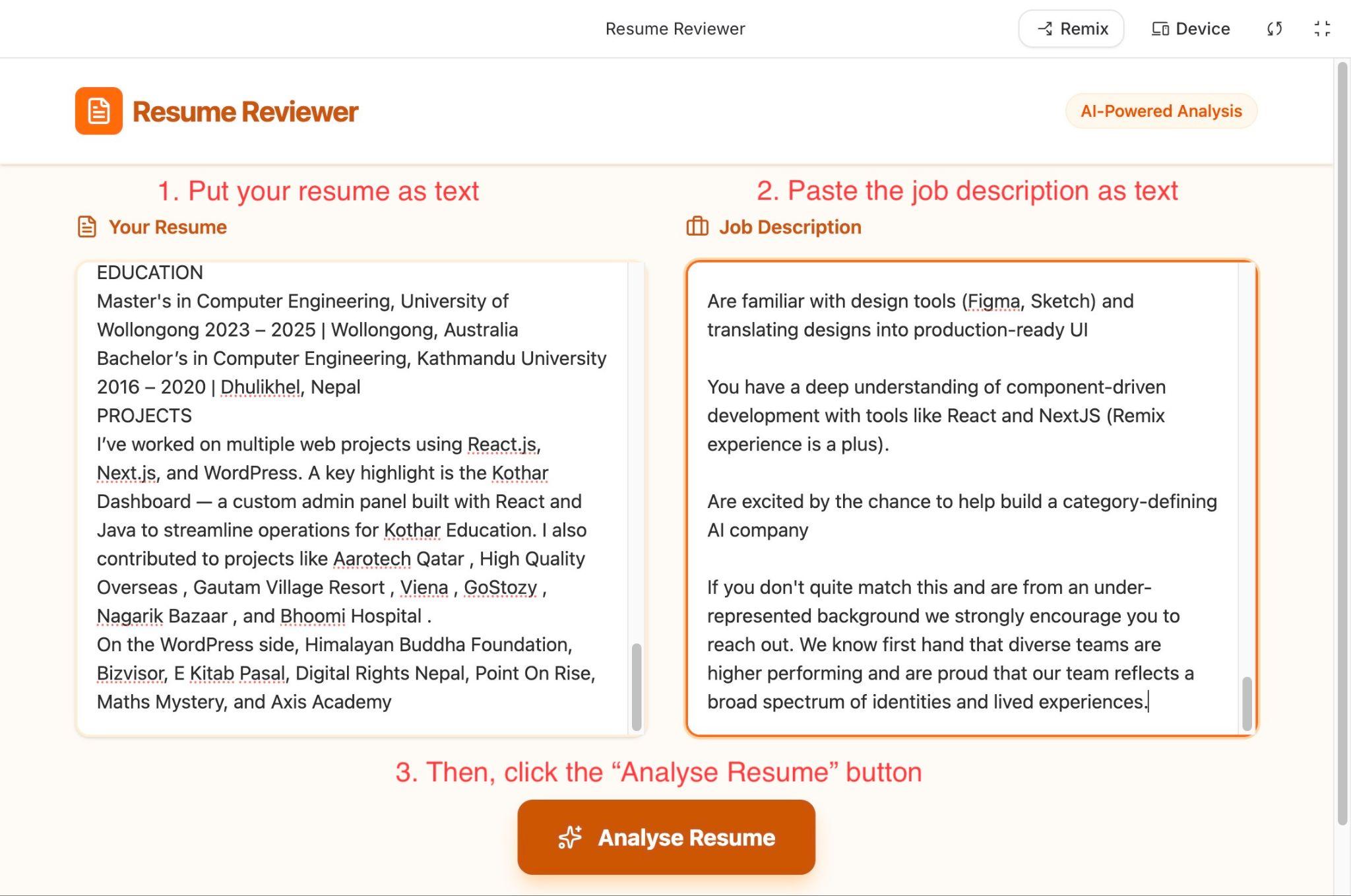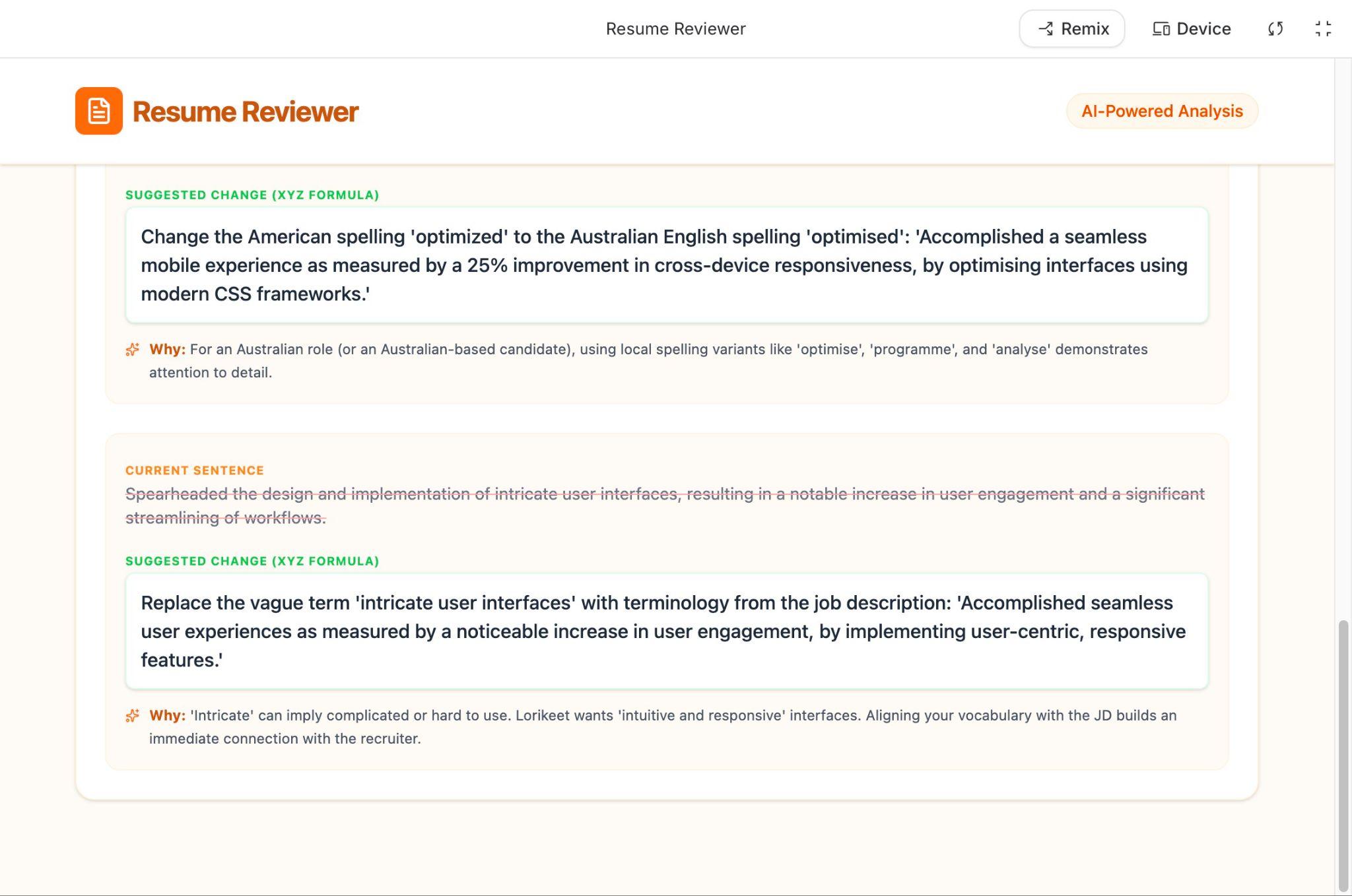 Build an intelligent resume reviewer that analyses a resume against a job description, providing actionable feedback and suggestions based on the proven XYZ formula to help you stand out. Both the resume and the job description are also uploaded as text.