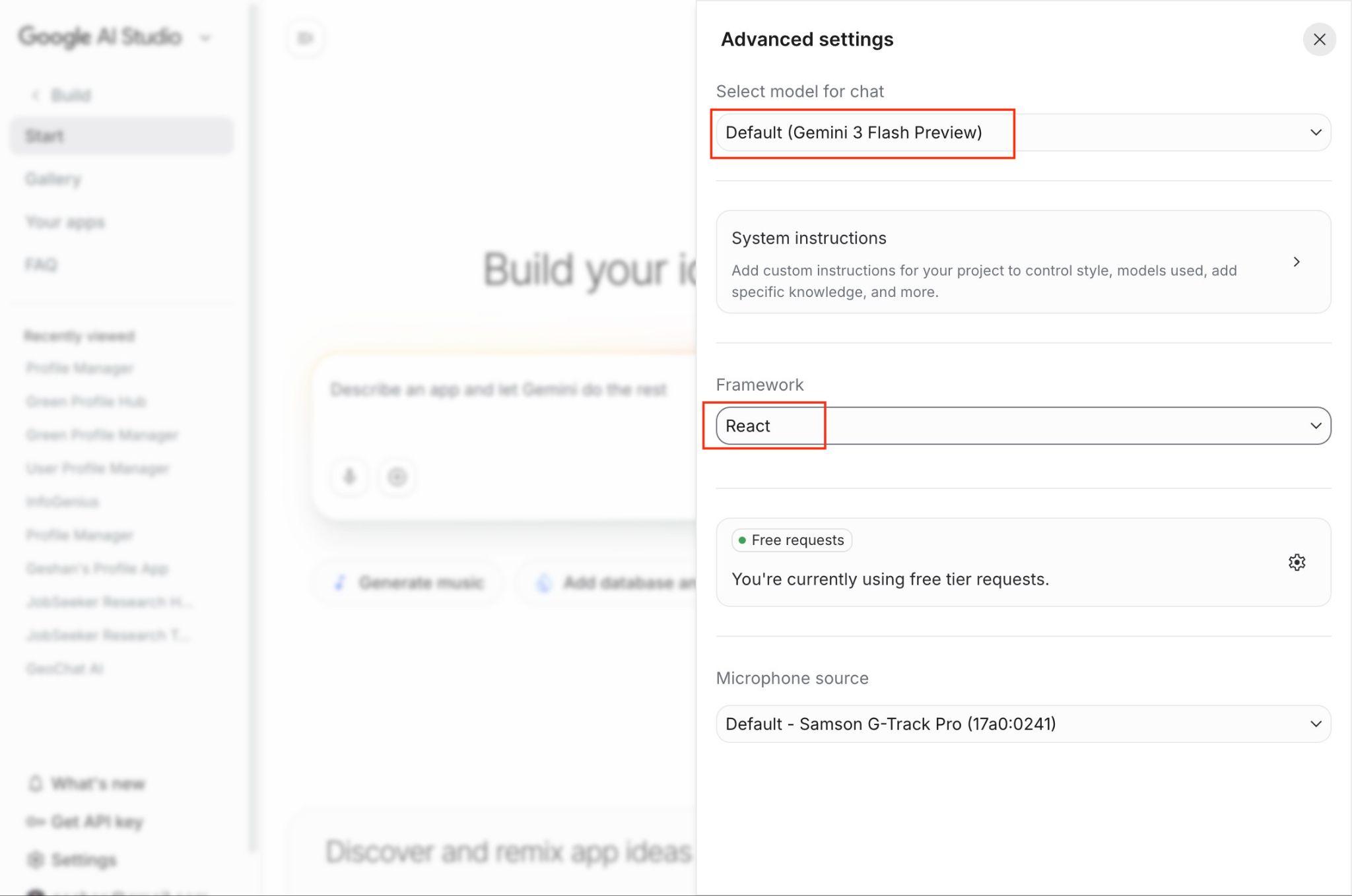 After that, select the "Gemini 3 Flash Preview" in the model and React as the framework, as seen below: