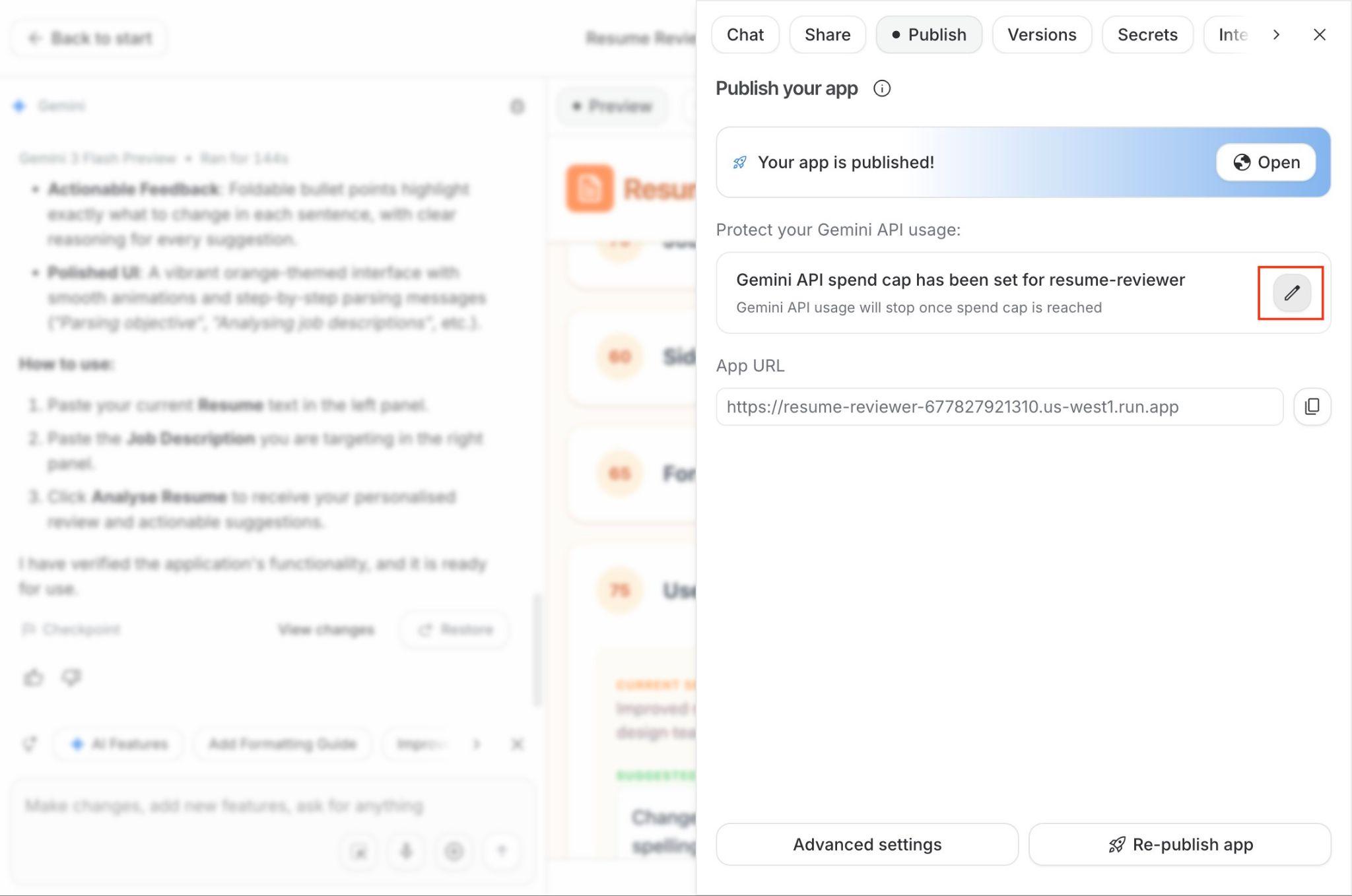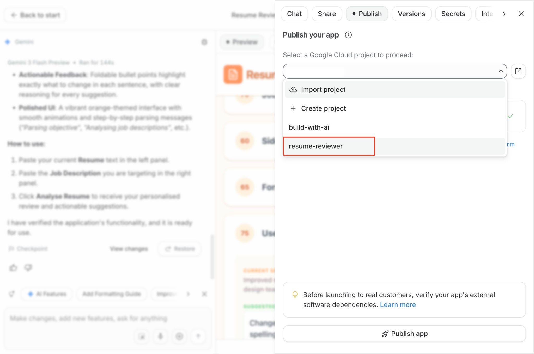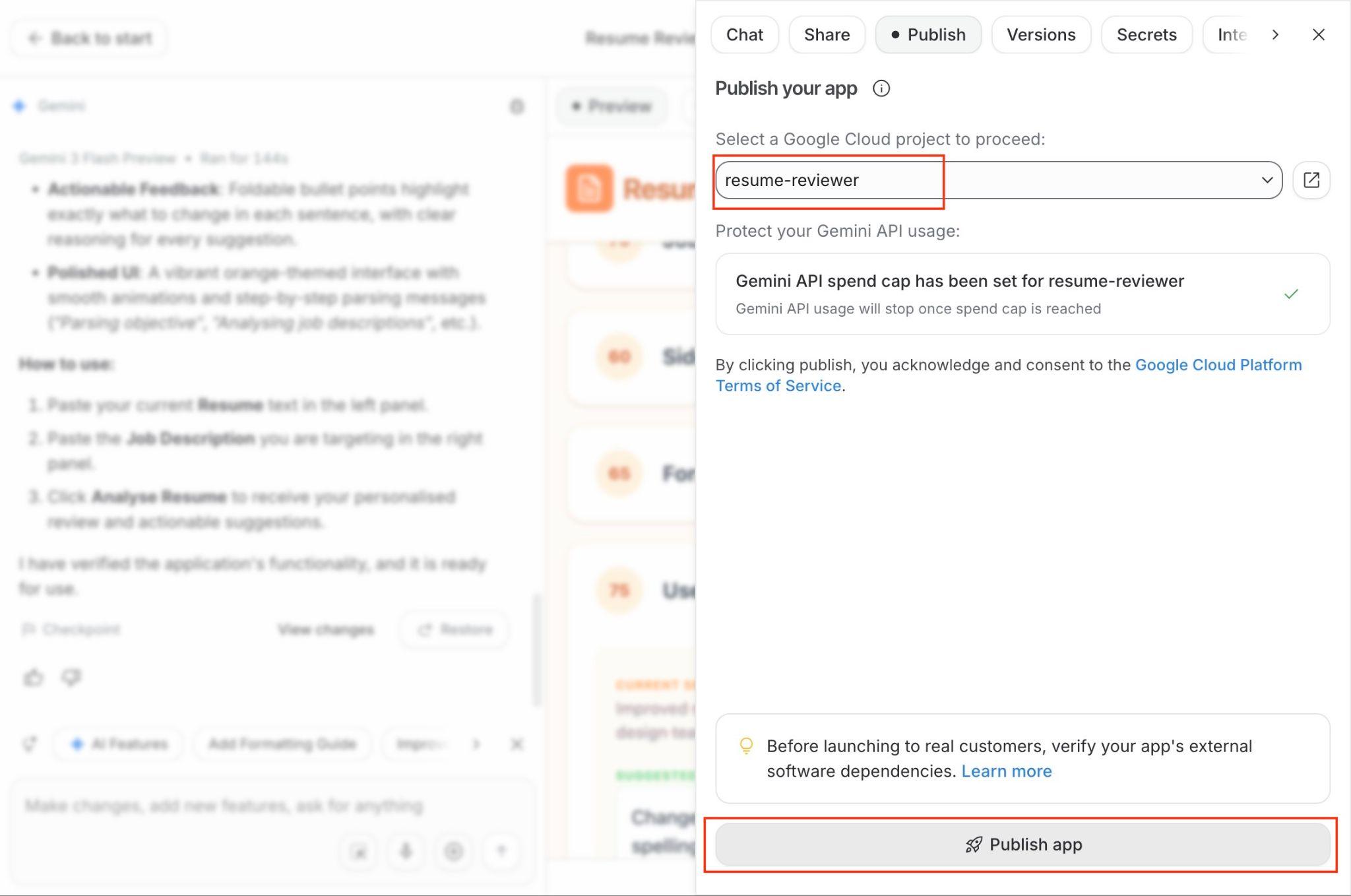 In the next part, you will deploy (publish) the resume reviewer on Google Cloud Run over a Google Cloud Platform (GCP) project so that you can share it with anyone who has the link to the published resume reviewer app.
