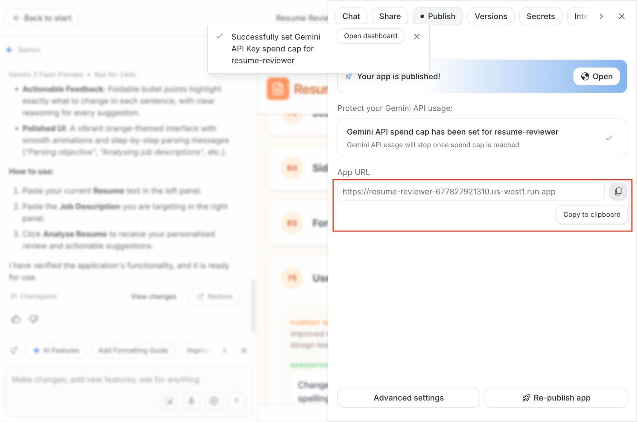 Congratulations, you've successfully built your own resume reviewer app and published it on Google Cloud Run!
