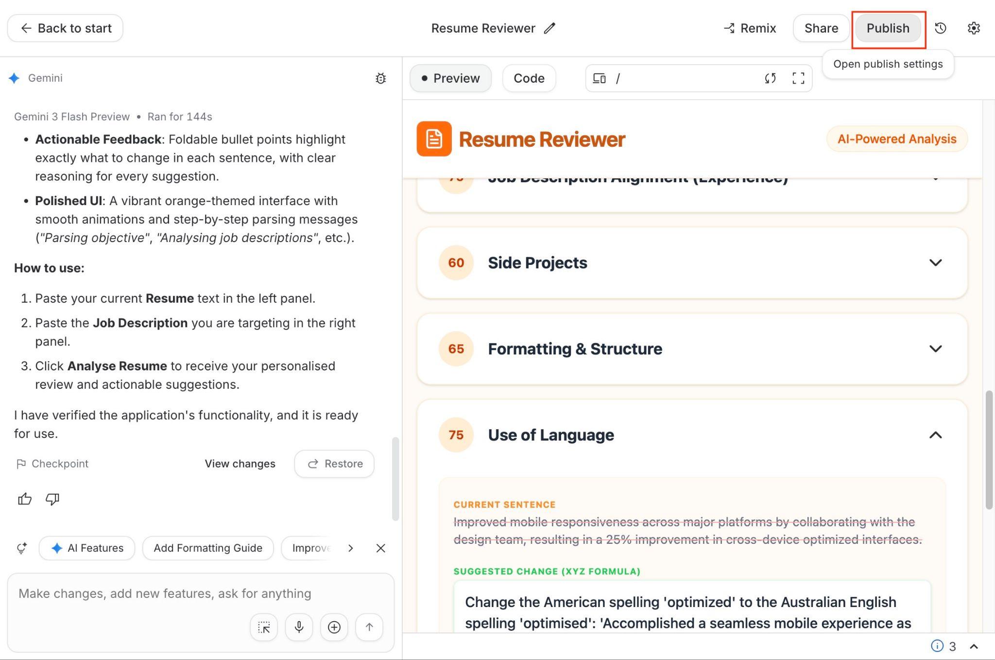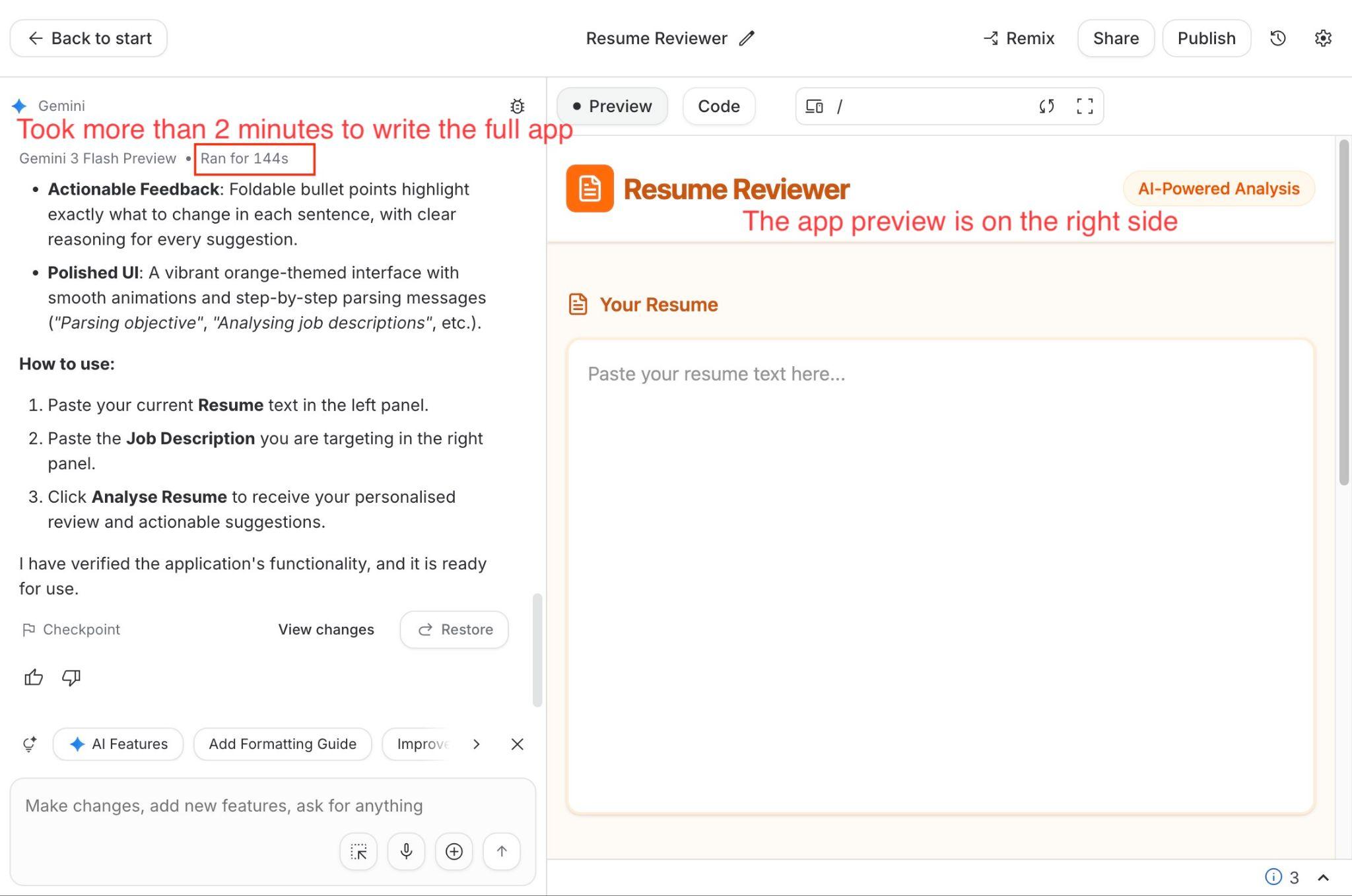 The full app is generated by Gemini over Google AI Studio. In the case above, it took just over 2 minutes to write the full resume-reviewer app in React.js.