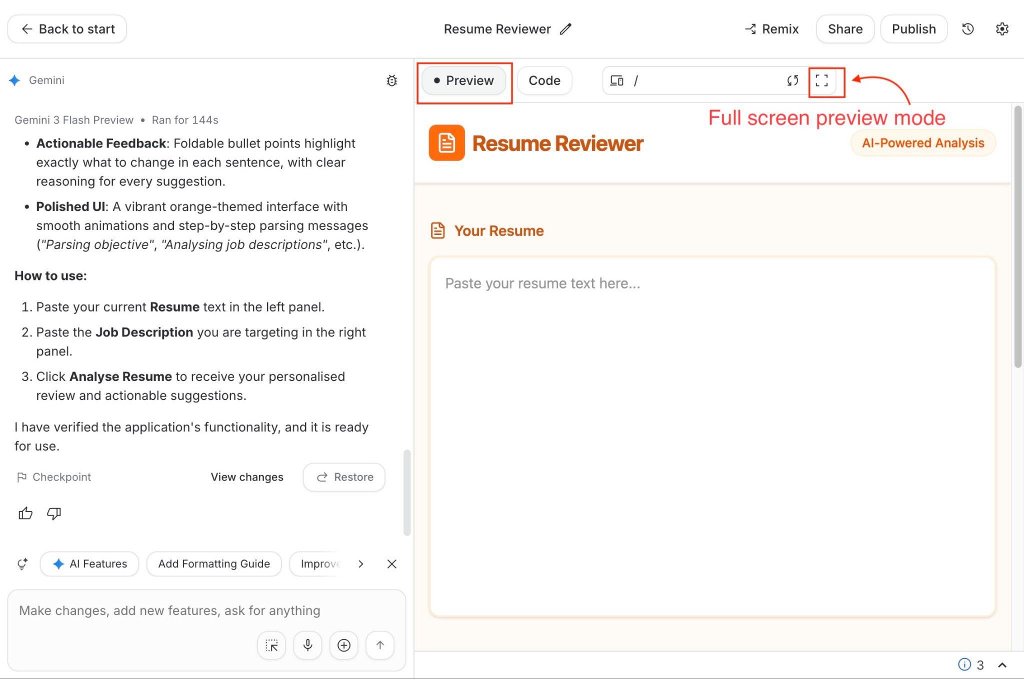 To test the generated app in full-screen mode, you will need a resume. For that, we will use a sample frontend engineer resume in text format. Here is one for you to test.