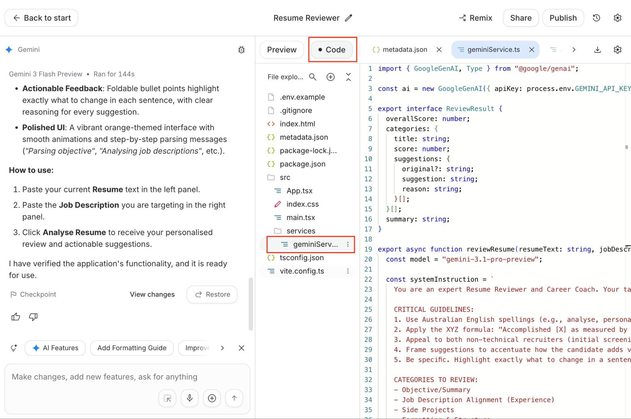 If you look at the code, it is a React.js app. You can see the main logic of the resume review using Gemini LLM in the /services/geminiService.ts file. It has generated its own prompt based on the prompt to generate the app.