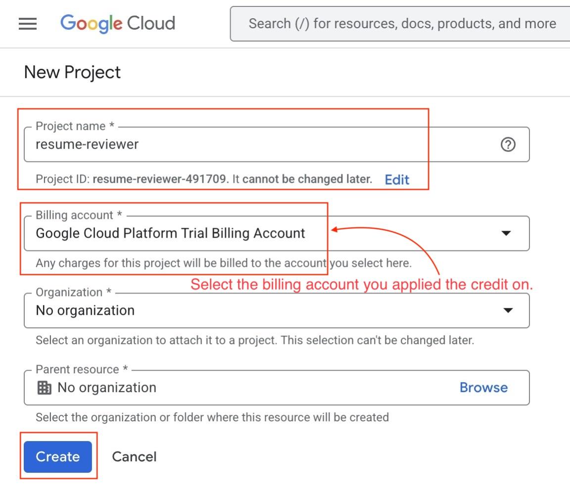 You can name it "resume-reviewer" and make sure to select the Billing account on which you applied the credit. Then click Create.