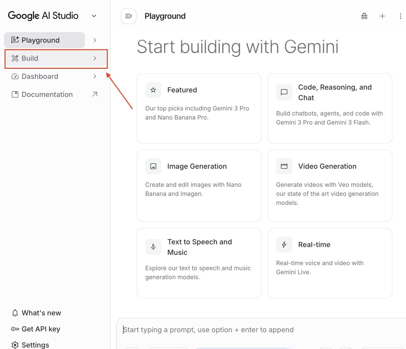 To go to the Build feature of Google AI Studio, you can click the Build menu item on the left navigation, as seen below: