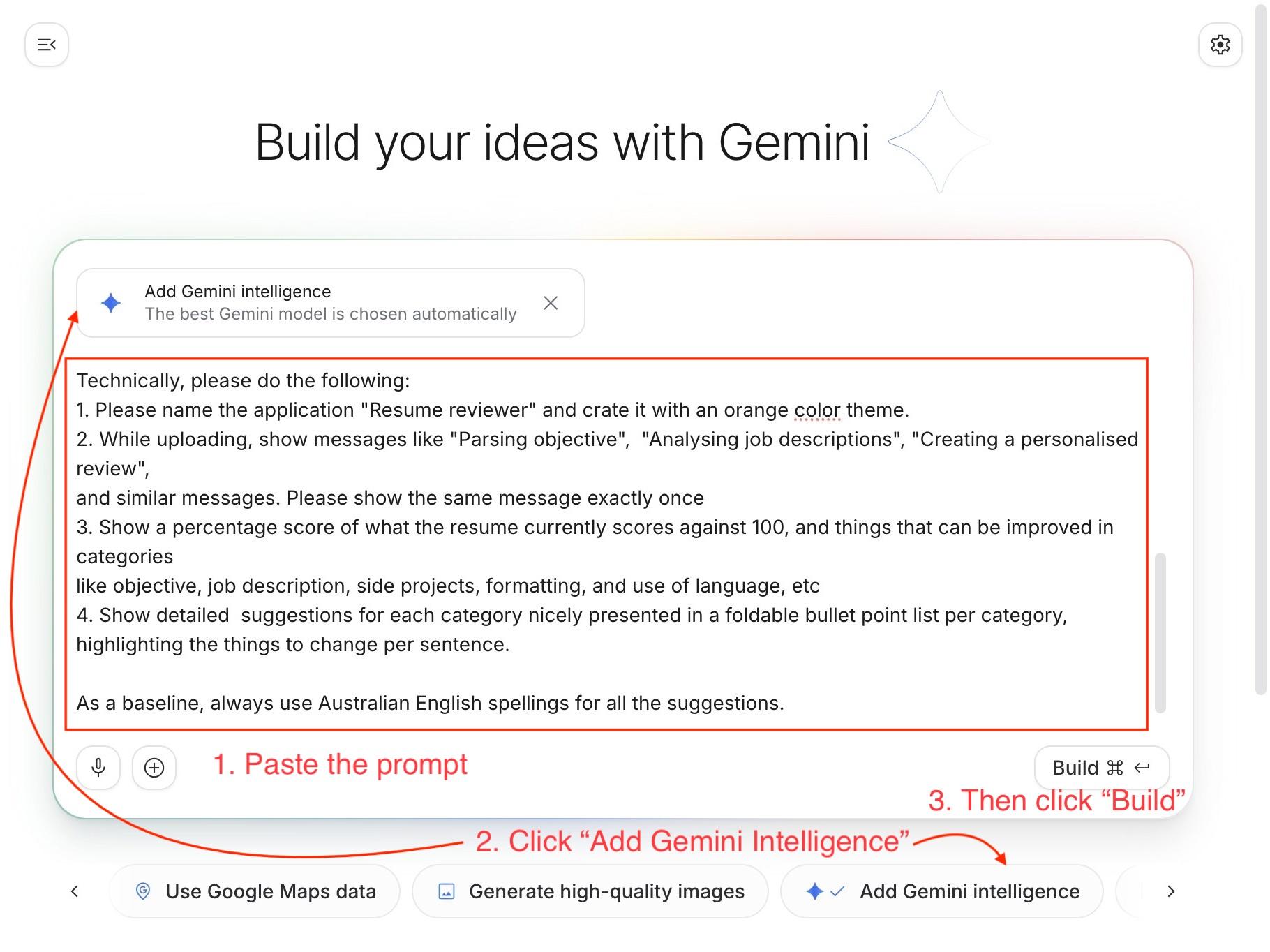 You can edit the prompt if you like, or just paste the prompt on Google AI Studio Build feature, then also find and click the "Add Gemini intelligence" option under the form, as seen below: